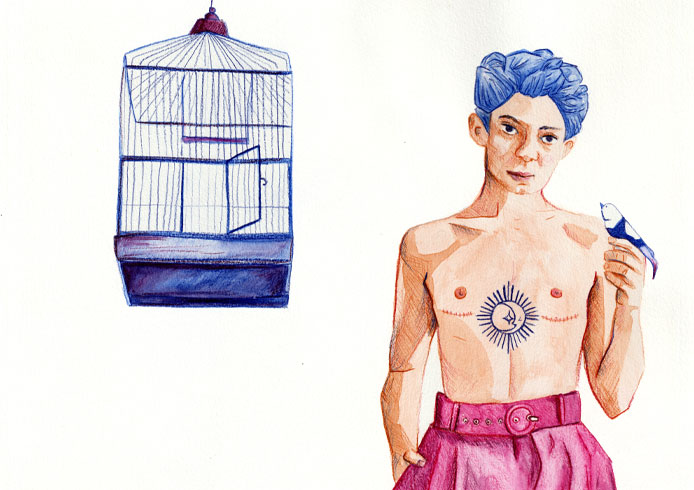 Le portrait de Lachlan Watson, torse nu, dévoilant les marques de sa mastectomie aux côtés d’un oiseau libéré de sa cage, m’a profondément ému.